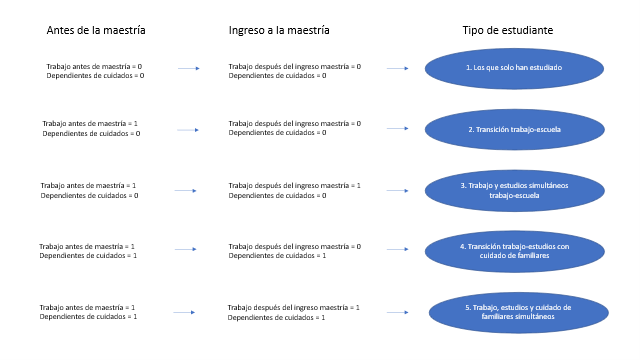 Posteriormente, mediante la utilización de filtros a través de la lógica booleana en la base de datos del paquete estadístico de SPSS se construyeron las siguientes tipologías de estudiante al momento del ingreso a la maestría como primera transición: